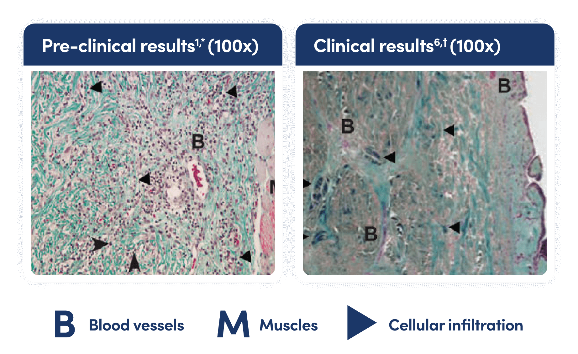 In a clinical setting, 13 patients underwent a second planned procedure where the graft was biopsied, and robust revascularization and incorporation were observed.6,†