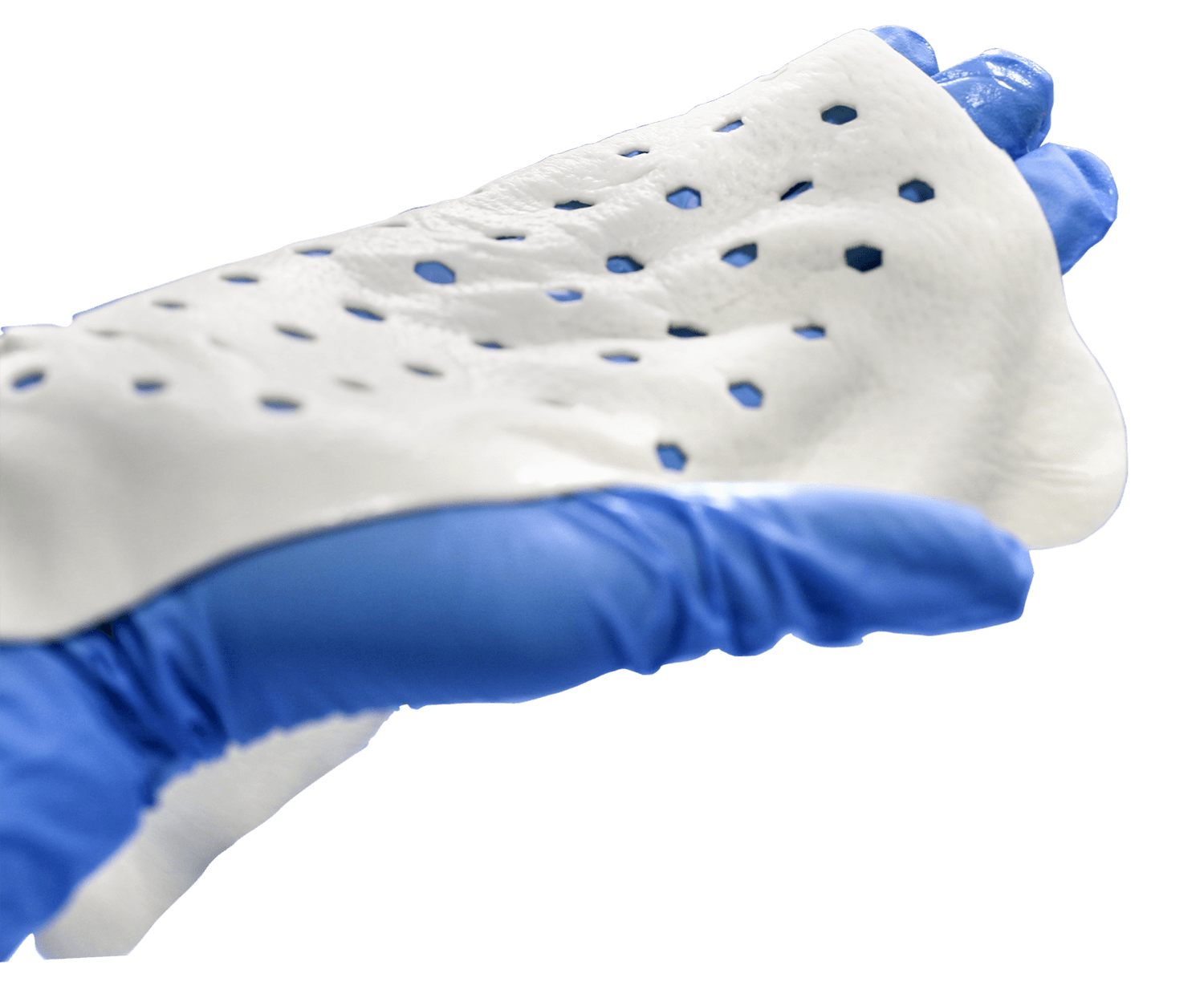 Cortiva® 1mm Perforated Tailored and Cortiva® 1mm Perforated allograft dermis grafts feature a consistent, precision-engineered perforation pattern of 5mm hexagonal openings, enabling multidirectional expansion for exceptional drape, flexibility, and conformability to contoured and complex surfaces.1,2,3,4,*,† This open geometry was shown to support effective fluid exchange while delivering predictable handling in a wide range of surgical applications.1