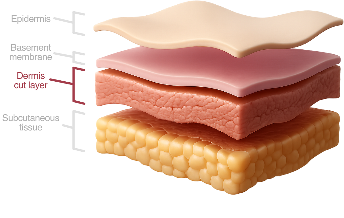 Cortiva Silhouette® allograft dermis grafts are cut from a deeper layer of the dermis, without the basement membrane, to remove orientation and to support greater pliability.1